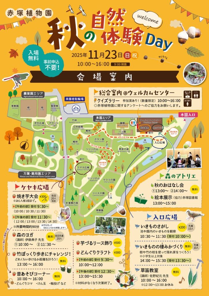 板橋区立赤塚植物園では、2025年11月23日(日・祝)に「秋の自然体験Day」が開催。焼き芋大会や秋のおはなし会、自然クラフトなど、秋の自然を満喫できるイベントです。