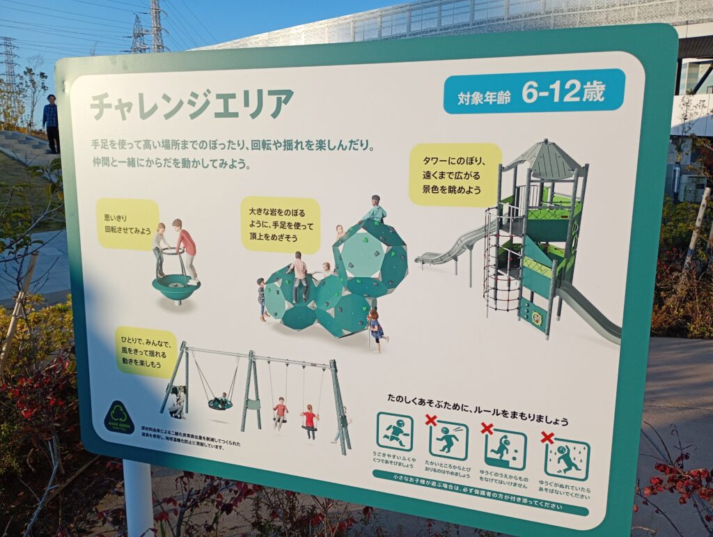 そして、今回の目当てはボーネルンドがプロデュースしたユニークな遊具です。広場は年齢別に「イマジネーションエリア」(3〜6歳)と「チャレンジエリア」(6〜12歳)に分かれており、特にタワー型遊具「メガデッキ」や多様なクライミング、ネット遊具などが楽しめます。