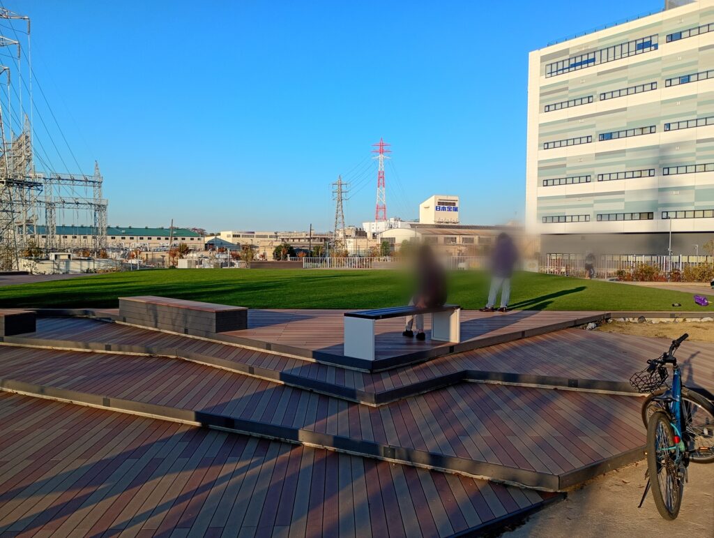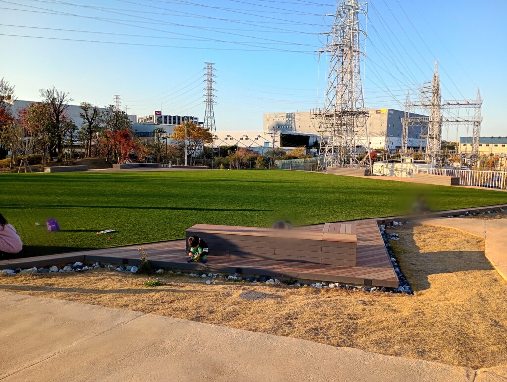 公園は新河岸川と荒川に挟まれた工場や物流施設が並ぶ一帯にあり、とっても広々としています。