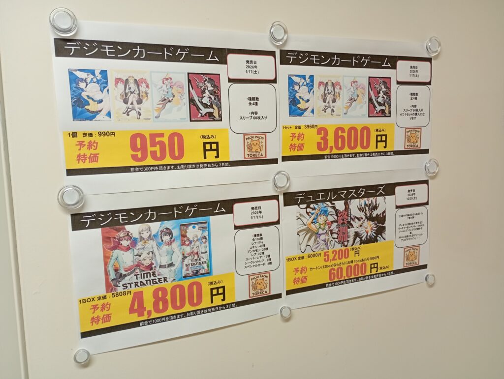 デュエマやデジモン、色々な種類のトレカを扱っているみたいですね。オープン当日はセール商品を目当てに長蛇の列ができ、整理券が配布されていたそうです。