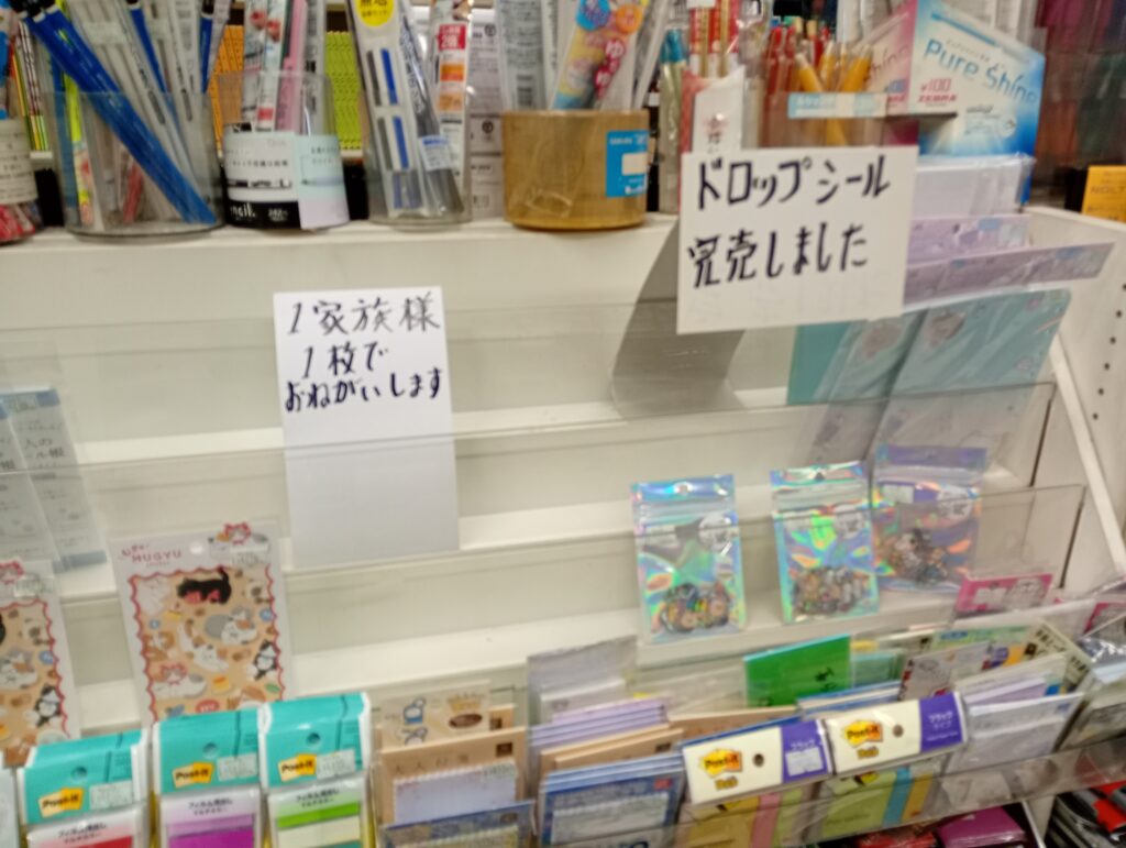 文教堂成増店に行ってみました。子育て世代の方々の立ち話でも「文教堂でボンドロ売ってたみたいよ。」という噂を聞いたので、期待を胸にお店に入ると「ボンボンドロップシール人気商品につき、おひとりさま各一個までとさせて頂きます」という掲示がありました。残念ながら、在庫はありませんでしたが、販売の痕跡が。