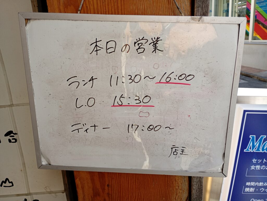 | 営業時間 | 月~木、祝前日:11:30~22:00 (L.O. 21:30) 金~日、祝日:11:30~翌0:00 (L.O. 23:30) ※ランチ営業は16時(L.O.15:30) ※最近は16~17時まで夜営業の準備をしているようです。 |
