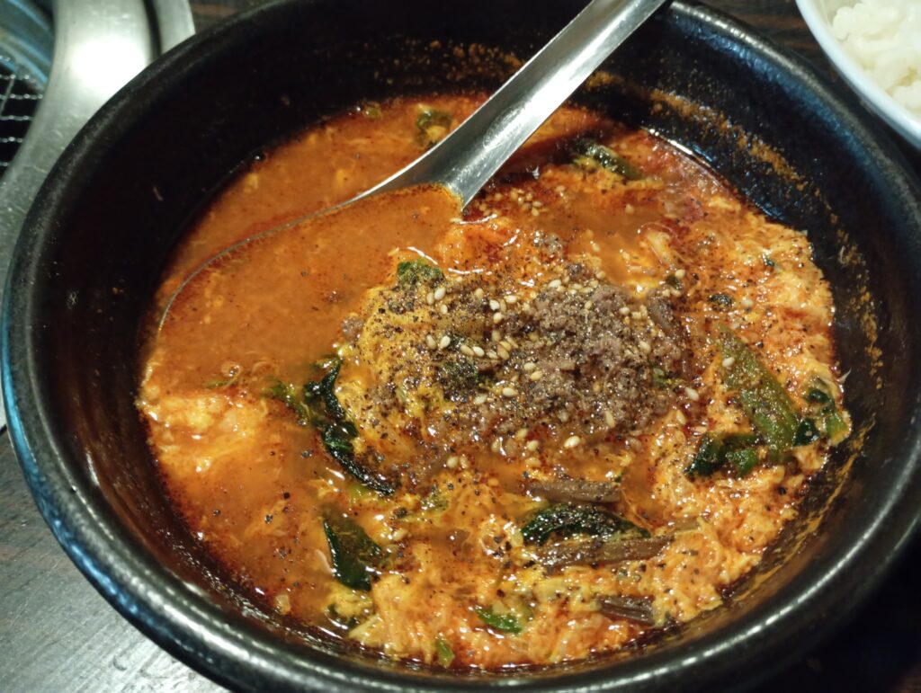 USカルビ定食の肉2倍を注文しました。USカルビ定食自体は880円(税込み)ですが、+310円で肉を二倍にすることができます。ランチからお肉がいっぱい食べられます。スープは+297円(税込み)でデビルスープにチェンジ。