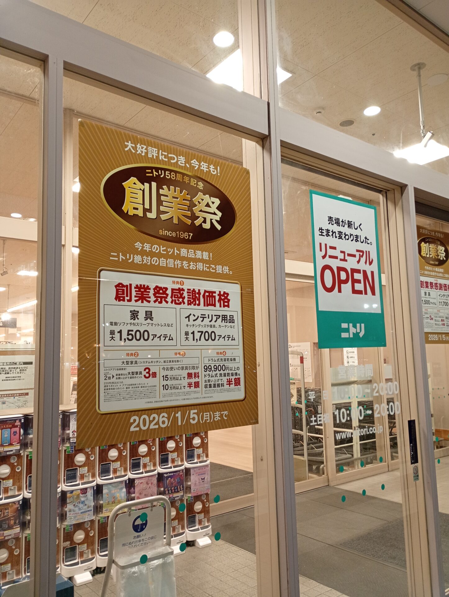リニューアルと同時に、年に一度のビッグセール「ニトリ58周年記念創業感謝祭」が開催中です!