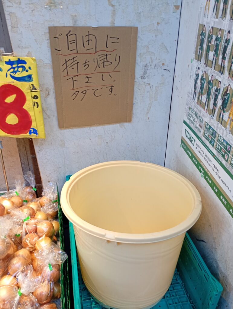 ハッピーロード大山ができる前から地域の台所を支え続けてきた大曽ストアー。店頭には、名物であった白菜の漬物の樽に、「ご自由にお持ち帰りください。」との貼り紙がされており、長年の感謝と寂しさがにじみ出ています。