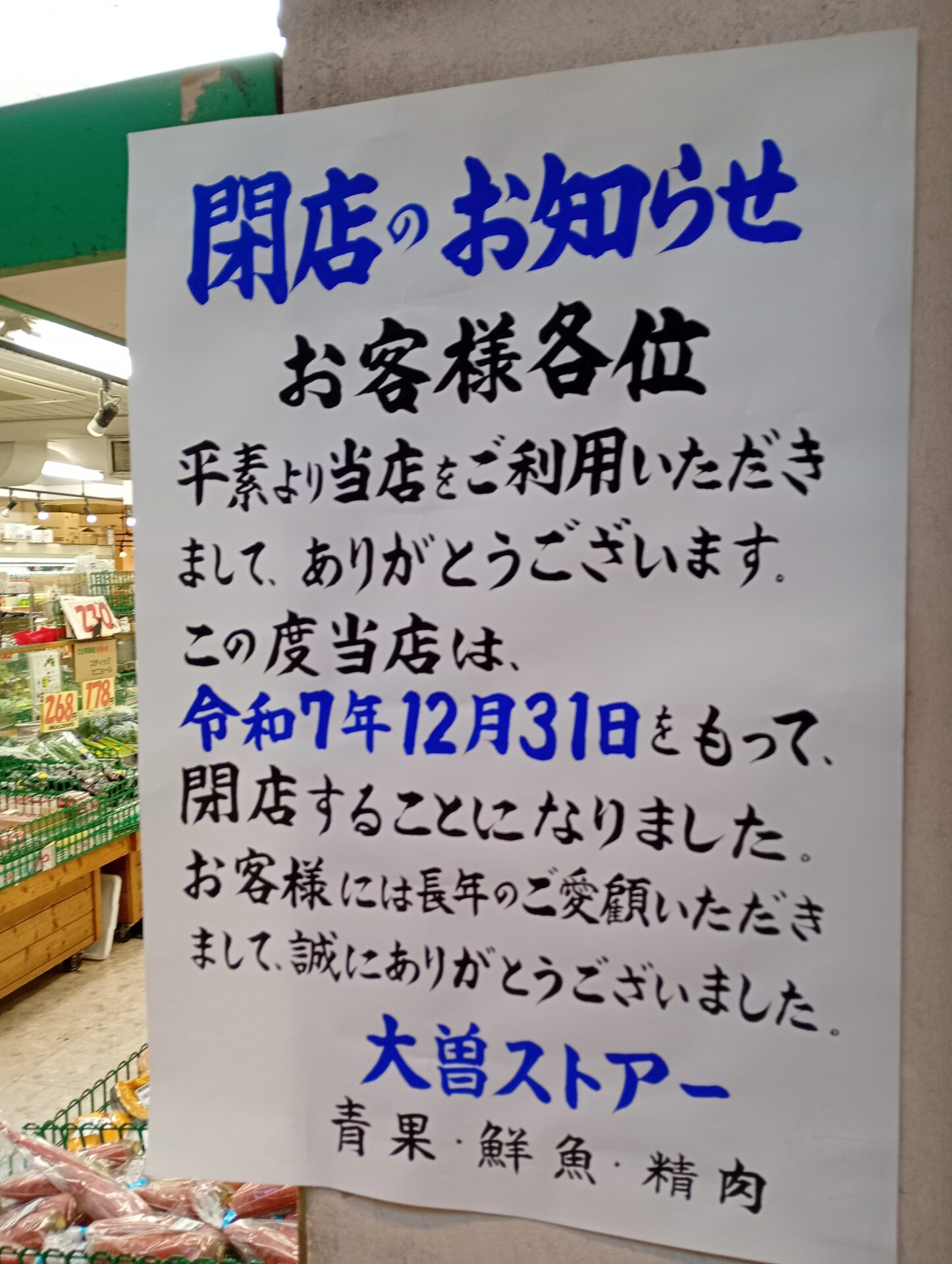 土地は売却されることとなり、大曽ストアーは閉店となります。これに伴い、併設していた鮮魚店や精肉店も営業を終えます。