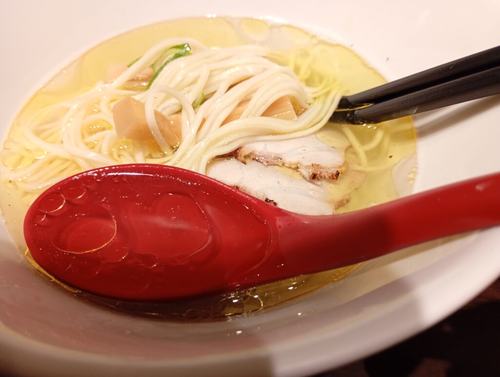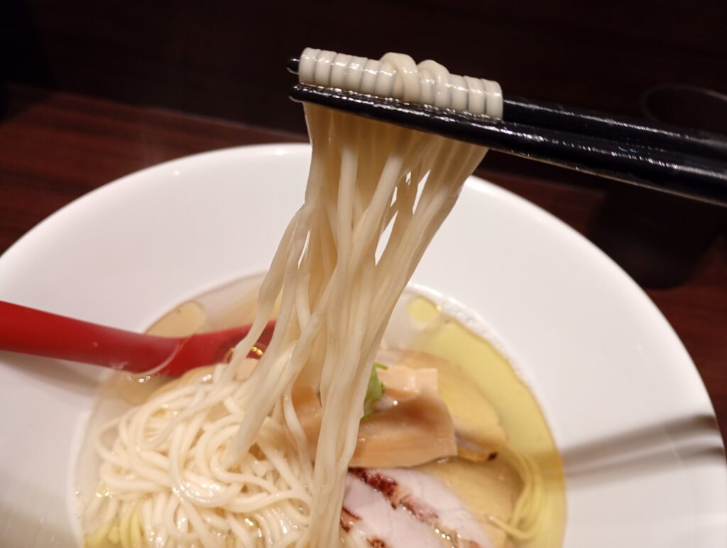 提供された「中華そば塩」のスープは、透き通るような美しさで、表面には名古屋コーチンの鶏湯(チーユ)が浮いています。一口飲むと、鶏の旨味が凝縮された極上の出汁が口の中に広がり、手が止まらなくなります。
