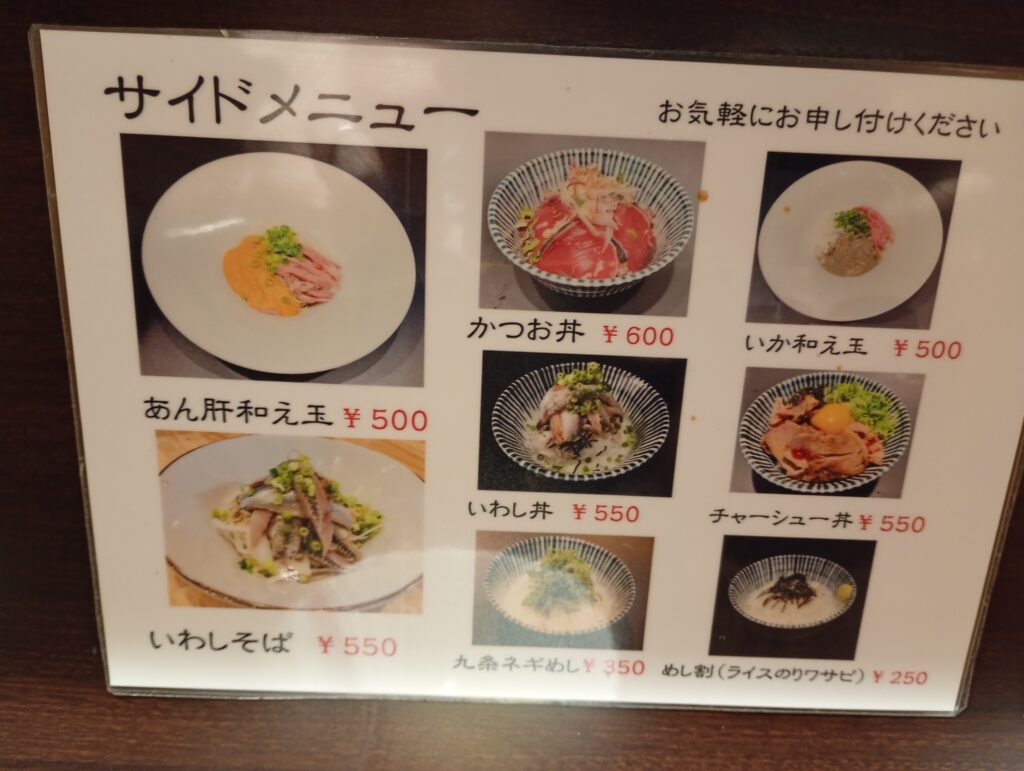 今回「中華そば塩」がとても美味しかったため、サイドメニューまで手が回りませんでしたが、再訪した際にはイワシ丼や鰹丼といった定番のサイドメニューにも挑戦してみようと強く思いました。