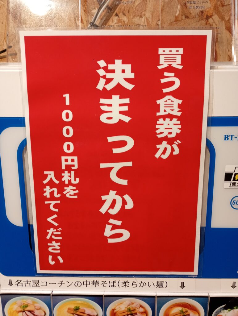 お店に入ると食券機があり、「買う食券が決まってから1000円札を入れてください」との掲示がありました。季節限定を含め魅力的なメニューが多すぎて迷うお客さんが多いため、時間が経つと返金されてしまうことを避けるための工夫だそうです。