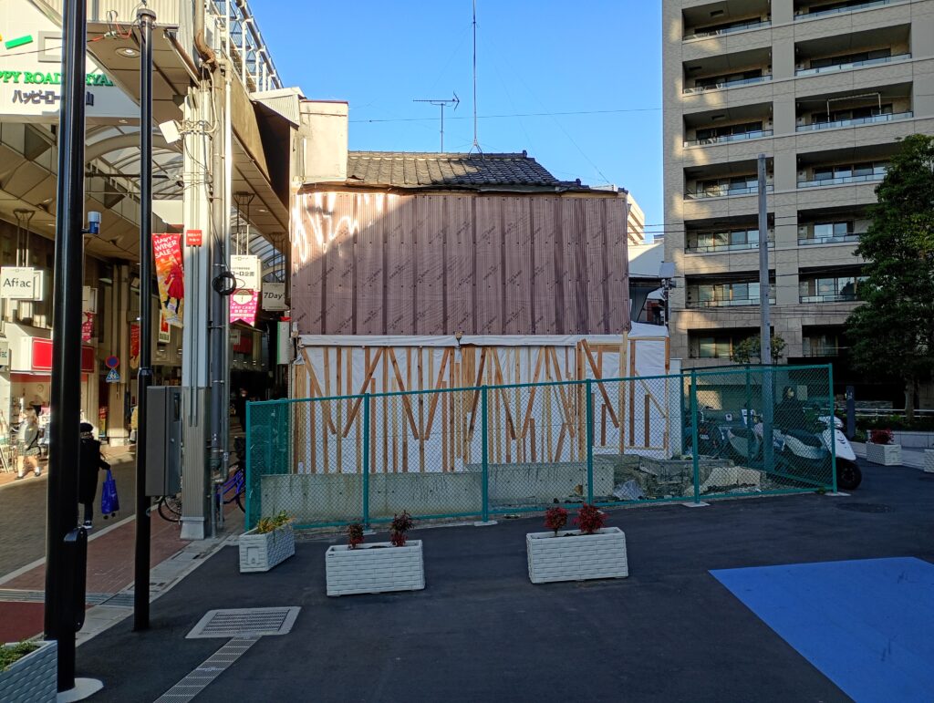 補助第26号線の延伸に伴い解体が予定されているエリアにも、まだ多くのテナントが営業を続けています。最近、建物が一つ取り壊され、基礎部が露出した敷地にはフェンスが設置されていました。