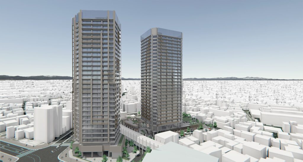 現在空き店舗が目立ち始めている地域は、「大山町ピッコロ・スクエア周辺地区第一種市街地再開発事業」の対象地です。約1.3ヘクタールの敷地に、地上28階建て、高さ約107mのツインタワーマンションが建設される予定です。