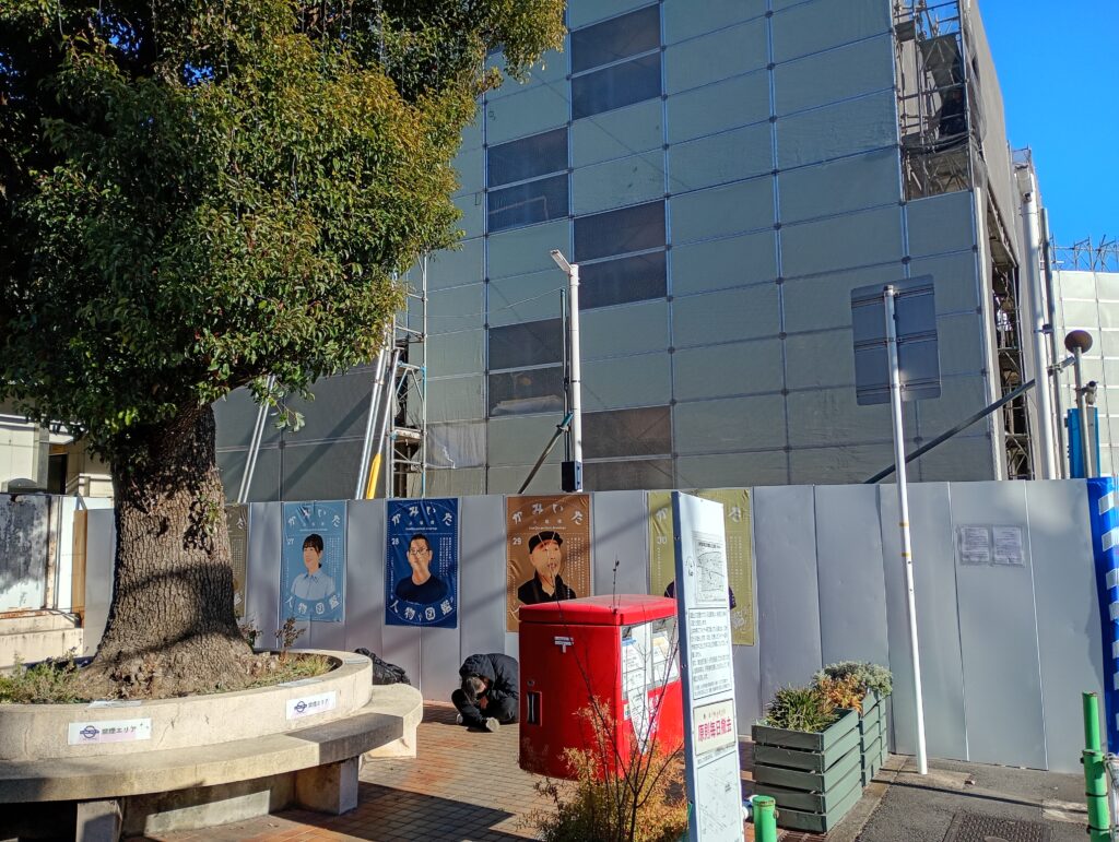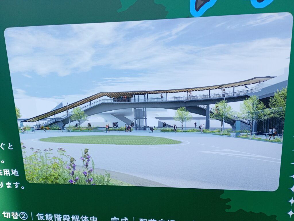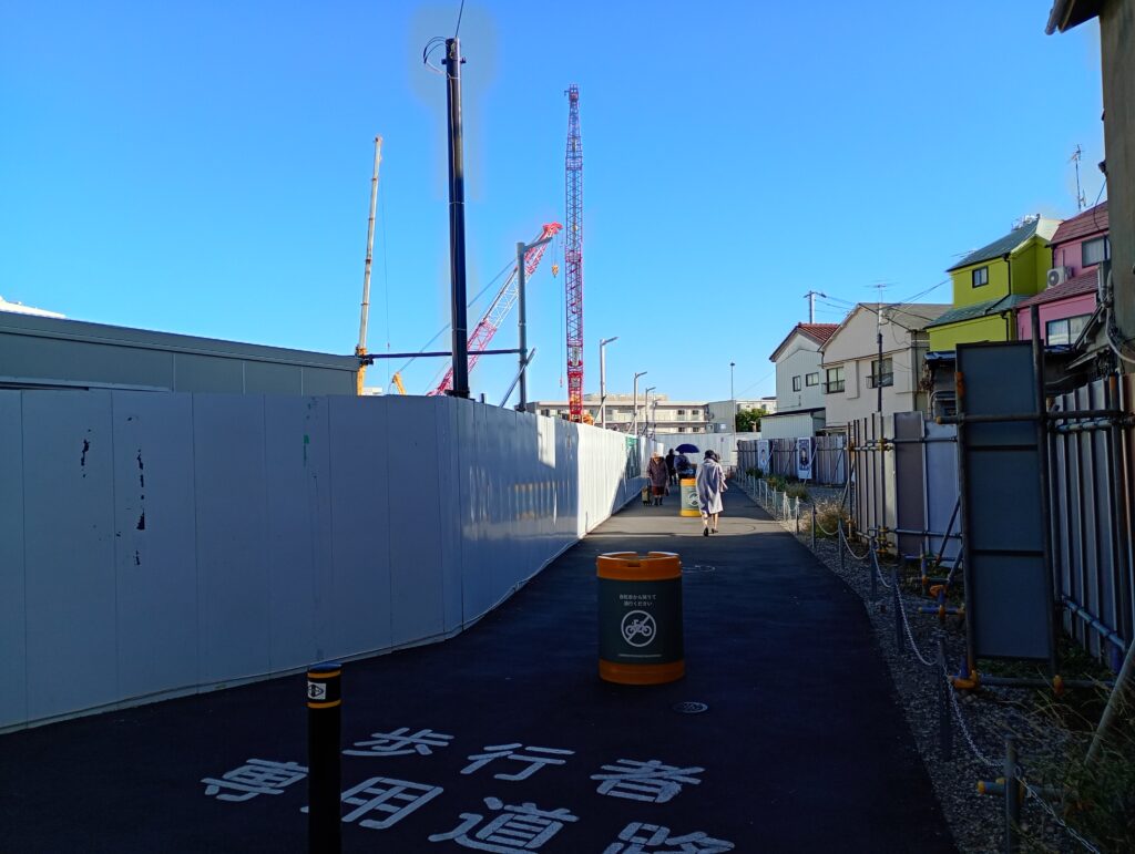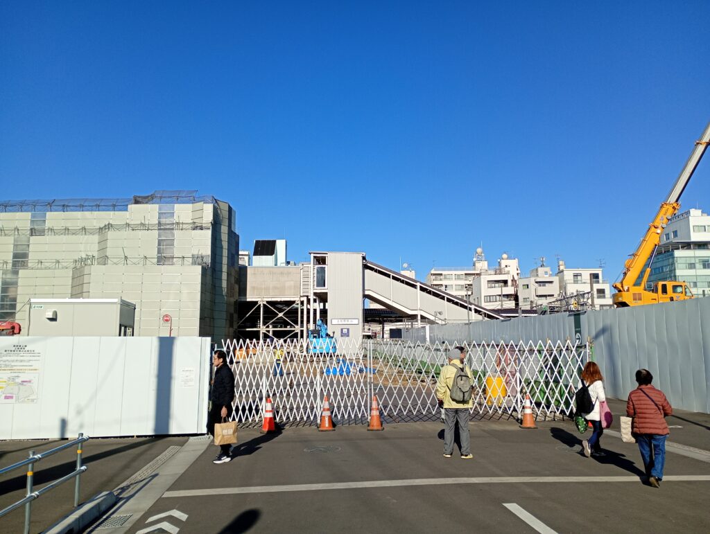 商店街を東へと折れ、駅の仮設階段へと続く道を進むと、そこには将来的に大きなロータリーとなる予定の広大な工事区域が広がっています。