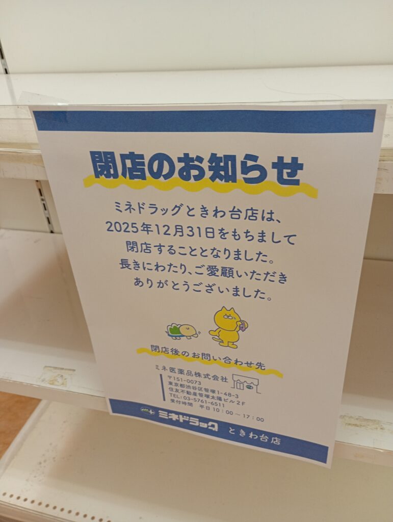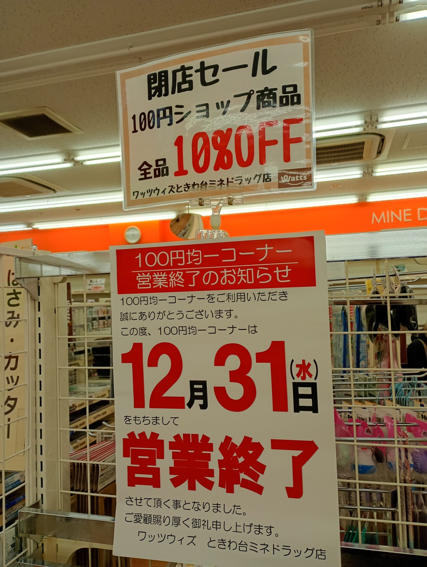 そんな活気の一方で、残念なニュースも。 2階の「ミネドラッグときわ台店」と、併設されている100円ショップ「ワッツ(Watts)」が、2025年12月31日(水)をもって閉店となります。