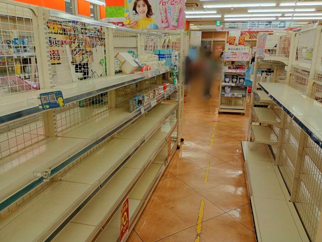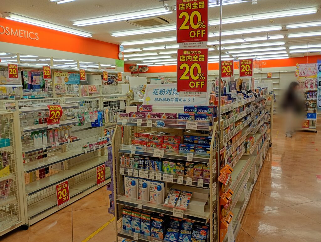 店内を覗いてみると、既に在庫が少なくなっている棚もありましたが、日用品や消耗品をまとめ買いするチャンスです。ドラッグストア内で100円ショップの商品も一緒に割引価格で買えるのは、閉店セールならではの光景でした。