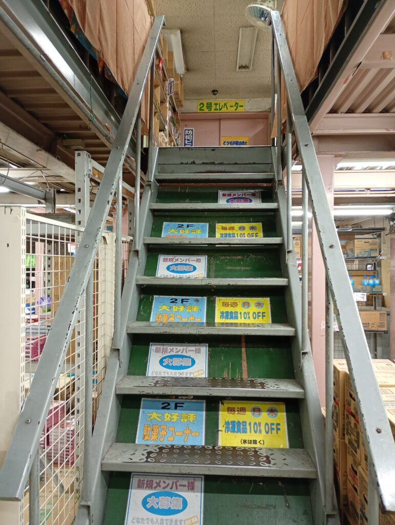 - 武骨な階段の先: 2階へと続く階段もまさに倉庫仕様。一般のスーパーでは味わえない、プロの仕入れ現場に紛れ込んだようなワクワク感が楽しめます。