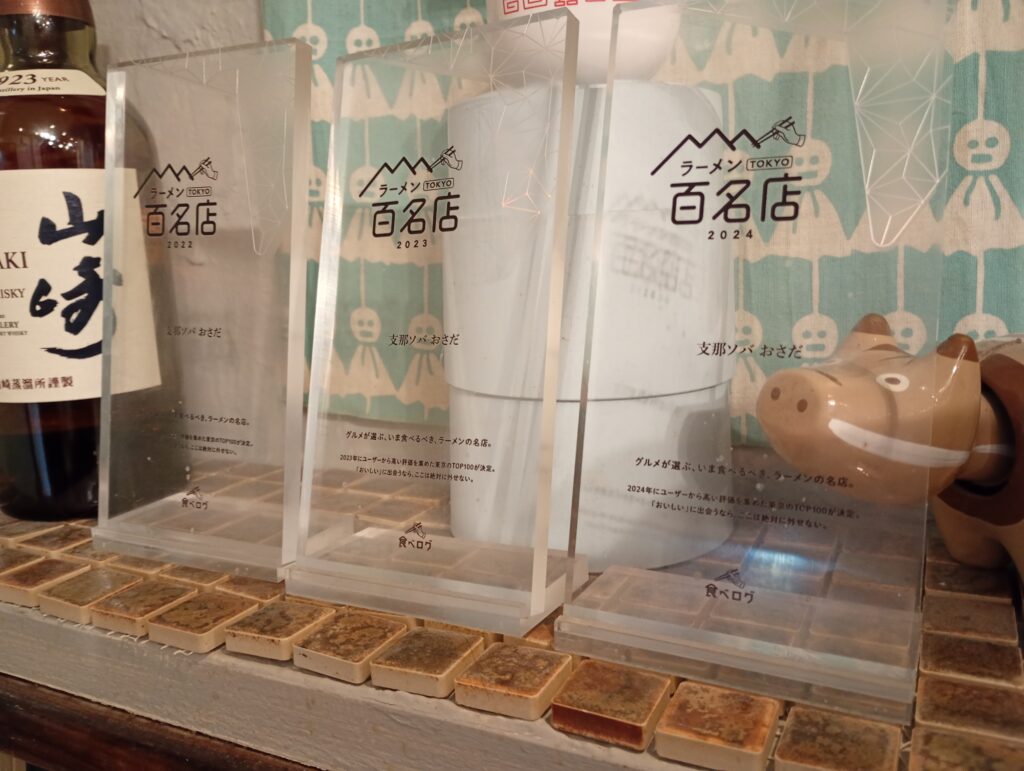 店内には2022年から2025年まで「食べログ百名店」を受賞し続けている記念トロフィーが並びます。東京都内のラーメン店の中でもトップクラスのスコア(3.8以上)を維持し、名実ともに「外さない名店」としての地位を確立している、その魅力に迫ります。