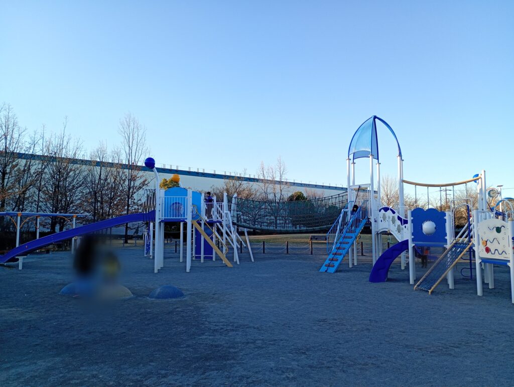 東京都練馬区にある大泉橋戸公園は、白い巨大な複合遊具が魅力です。長いローラーすべり台や吊り橋が子どもたちに大人気で、広々とした芝生広場ではピクニックも楽しめます。