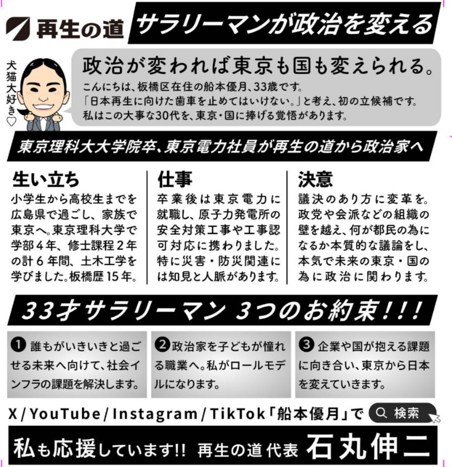 【船本優月(ふなもと・ゆづき)プロフィール】 1992年広島県生まれ。東京理科大学理工学部卒。東京電力ホールディングス株式会社勤務。2025年東京都議会議員選挙(板橋区選挙区)に出馬し14,096票を獲得。現在は地域団体「asITA25」責任者として活動中。X、Instagram、YOUTUBE。