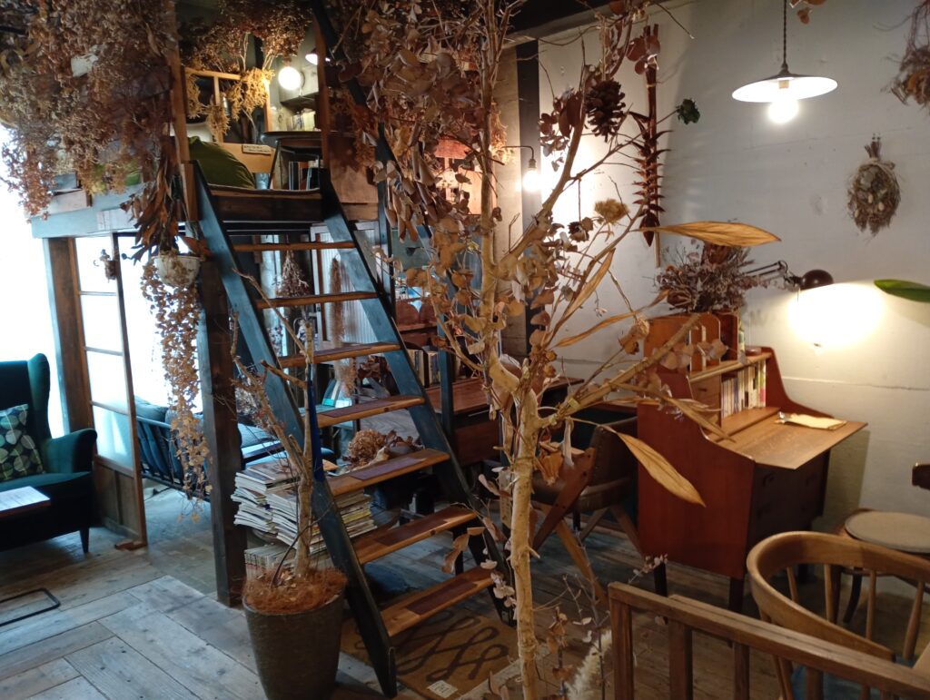店内は、左手にカフェスペース、右手に書店スペースと分かれています。 アンティーク調の家具と、活き活きとした緑、そして落ち着いた茶色の枯れ葉が混ざり合う植物の配置は、まるで静かな森の中に迷い込んだかのよう。