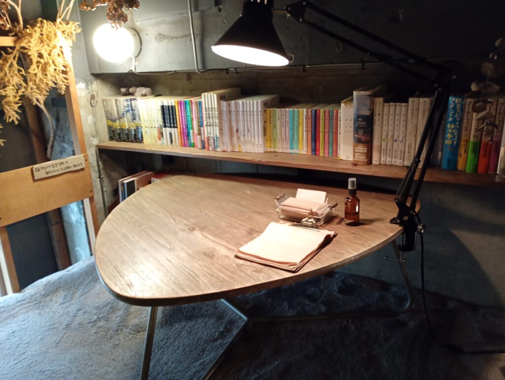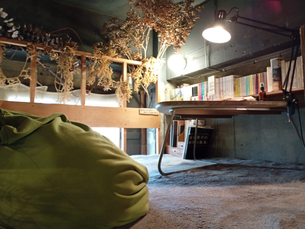 席を選ぼうと見渡すと、「中二階」になったスペースを発見しました。 靴を脱いで上がれば、そこにはビーズクッションと三角形の机。子供の頃に夢見た「秘密基地」そのものの空間に、思わず心が躍ります。クッションに身を預け、目の前の本を手に取れば、もうここから動きたくなくなるほどの心地よさです。