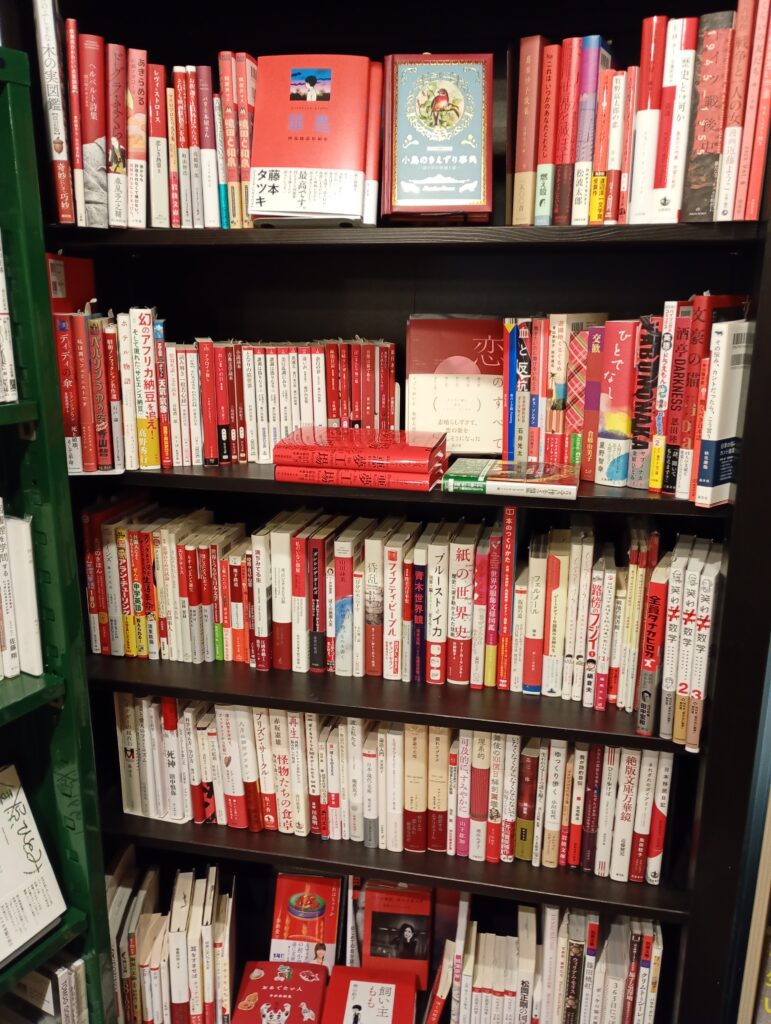 注文を待つ間、書店スペースへ。 ここの本棚は独特です。色別、ジャンル別、さらには金庫の中に入った重厚なコーナーまで、オーナー独自の「法則」で並んでいます。
