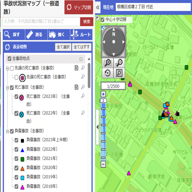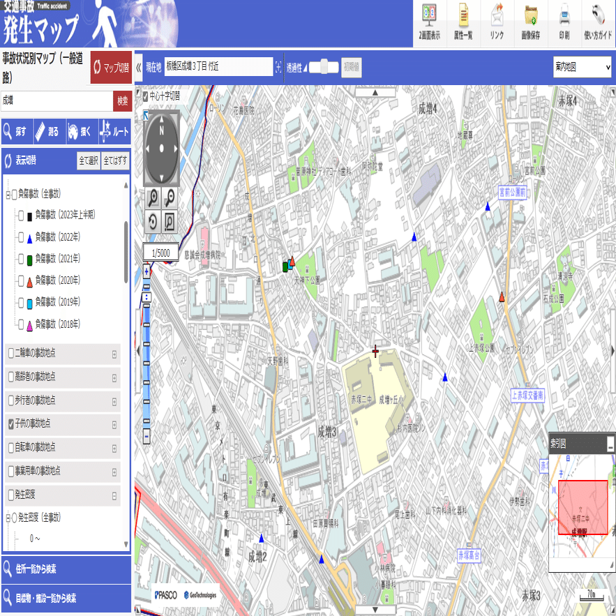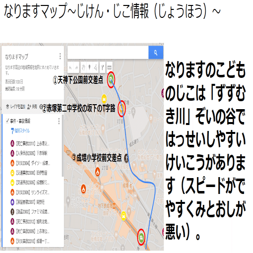 子供の事故発生状況を調べるために警視庁が作成する交通事故発生マップを参考にさせて頂きました。