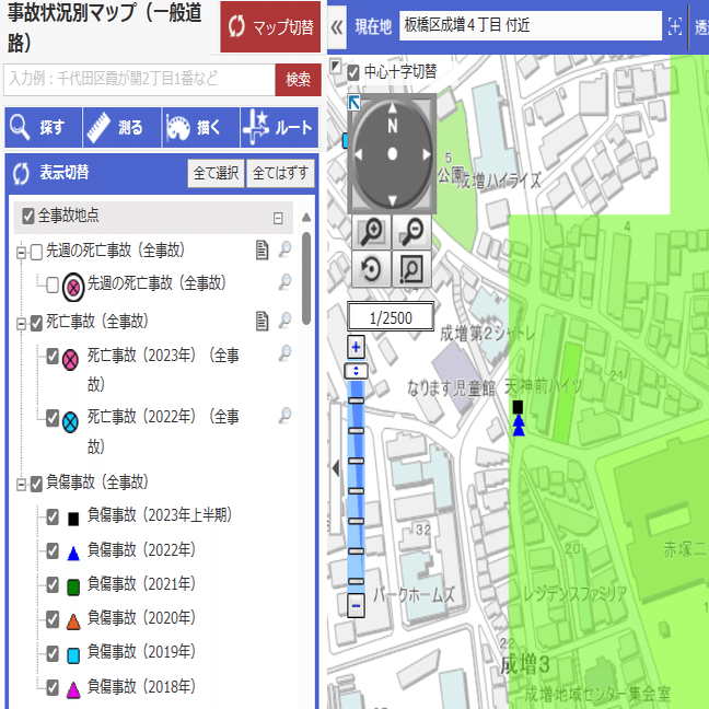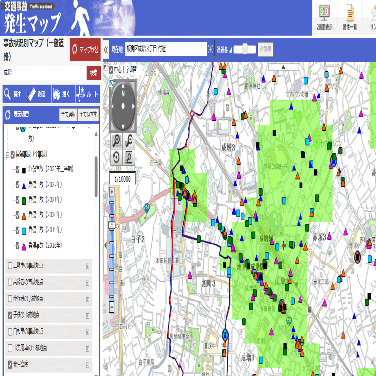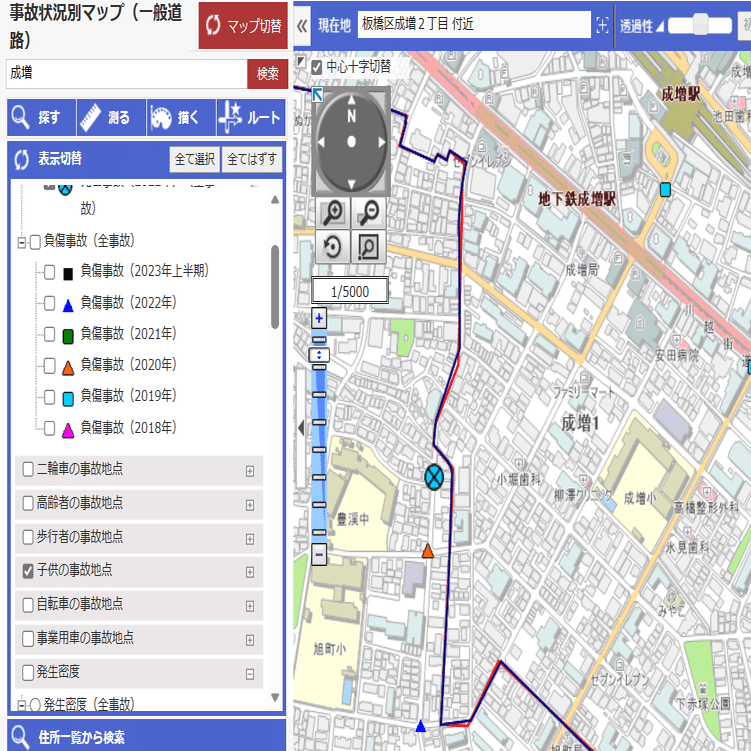 ここまでで成増周辺で子供の交通事故が起こりやすい場所を警視庁の事故発生マップから調べ、実地調査を行ってきました。
