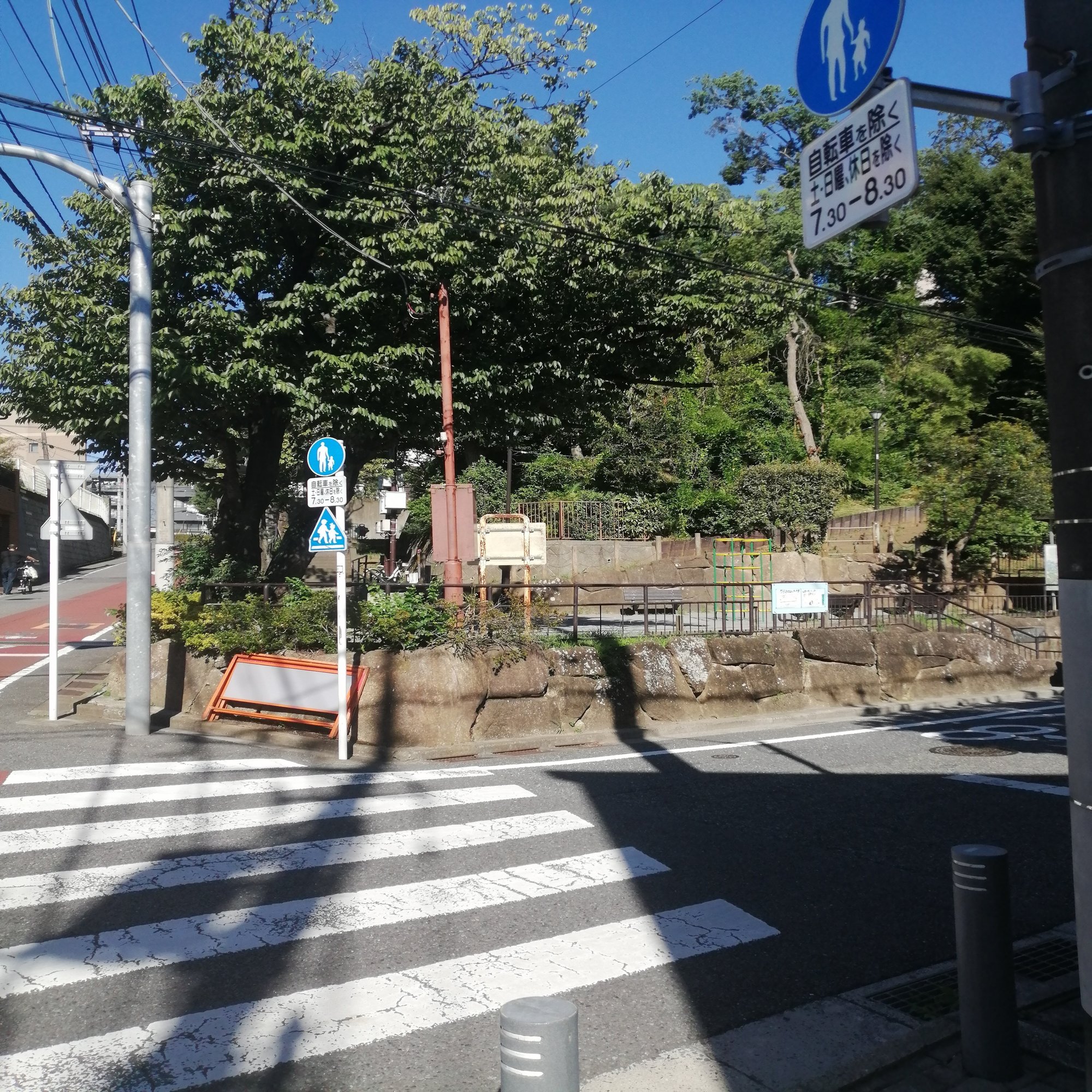 成増が丘小学校から坂道を下った場所にある「天神下公園前交差点」です。