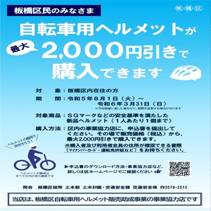 2023年4月から自転車乗車時のヘルメット着用が努力義務となっています。現在板橋区ではヘルメットの購入にあたって最大2,000円の補助金が給付されますので、この機会に購入されていては如何でしょうか。