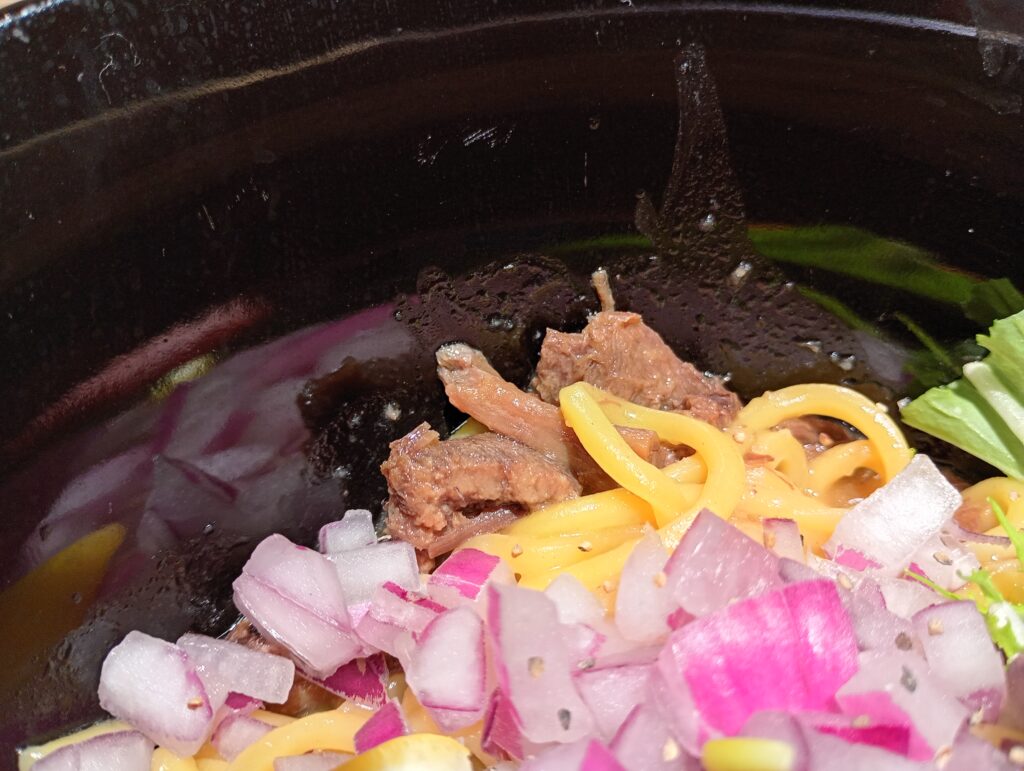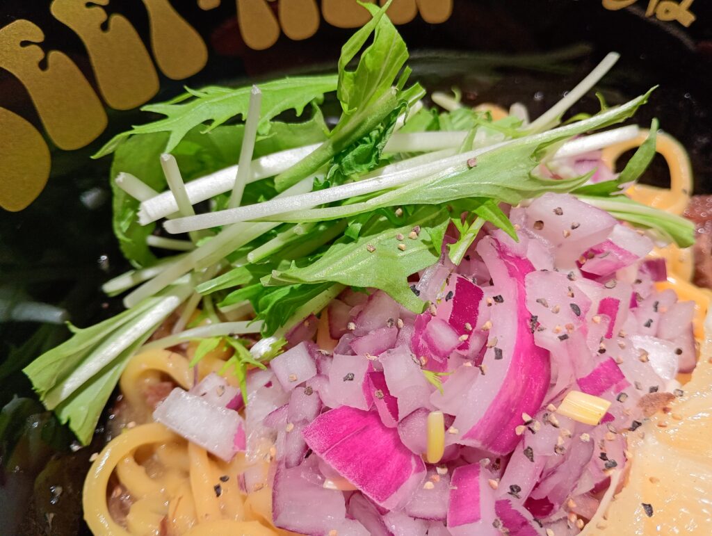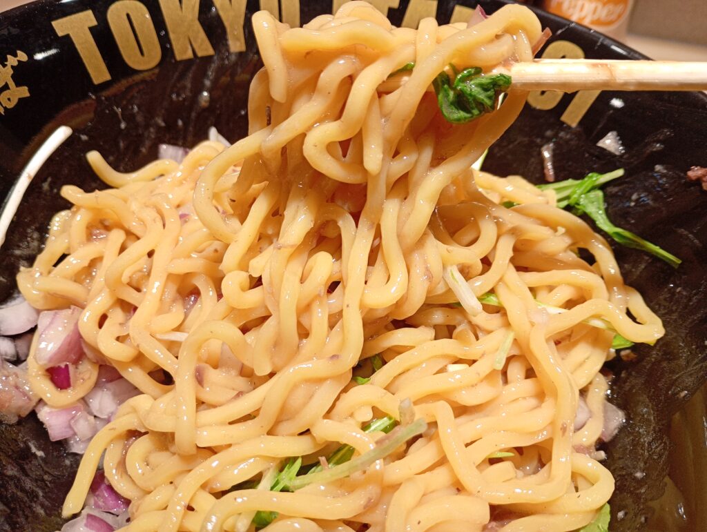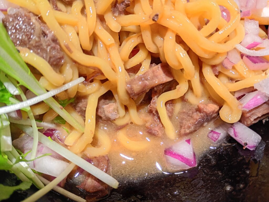 - 香りの衝撃: 麺を混ぜようと持ち上げた瞬間、底に溜まった特製タレから凝縮された牛の香りが一気に立ち上がります。