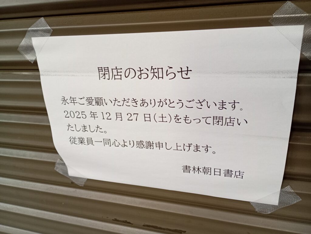 板橋区内では、地域に根ざした書店の閉店という、寂しいニュースが相次いでいます。 記憶に新しい2025年12月27日、志村坂上のマクドナルド横で街を見守り続けてきた「書林朝日書店」がその歴史に幕を下ろしました。