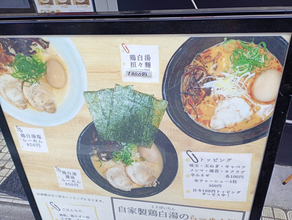 メニューは鶏白湯をベースに、塩、醤油、担々麺と魅力的なラインナップ。今回は王道の「鶏白湯 塩らーめん(850円)」をチョイスしました。