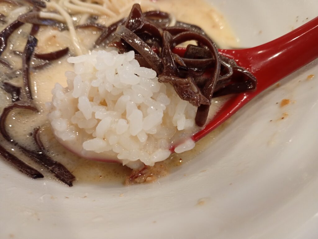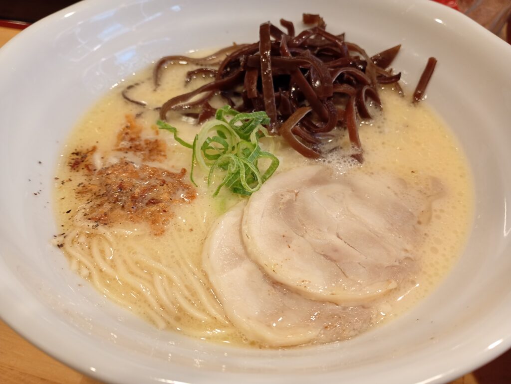 - 選べる無料トッピング: 味玉、玉ねぎ、キャベツ、メンマ、海苔、きくらげ、辛みネギから1品無料(今回は「きくらげ」を選択)。