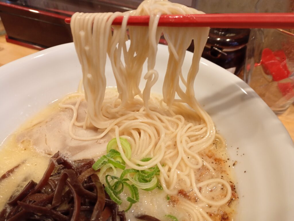 - 麺: スープの膜のおかげで、ストレートの中細麺にこれでもかとスープが絡みつきます。少し噛み応えのある麺は、濃厚スープに負けない存在感です。