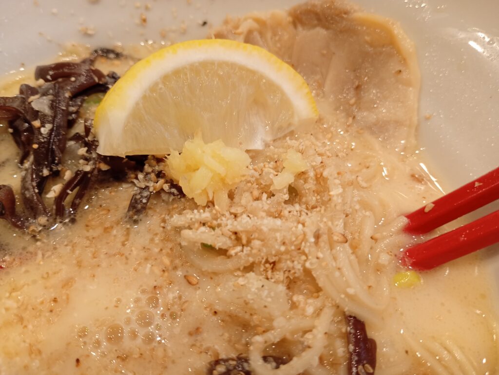 半分ほど食べ進めたところで、添えられたカットレモンをギュッと一絞り。 こってりした口の中を爽やかな酸味が駆け抜け、一気に表情が変わります。さらに卓上のすり胡麻や生姜を加えると、味がピリッと引き締まり、最後まで全く飽きさせません。