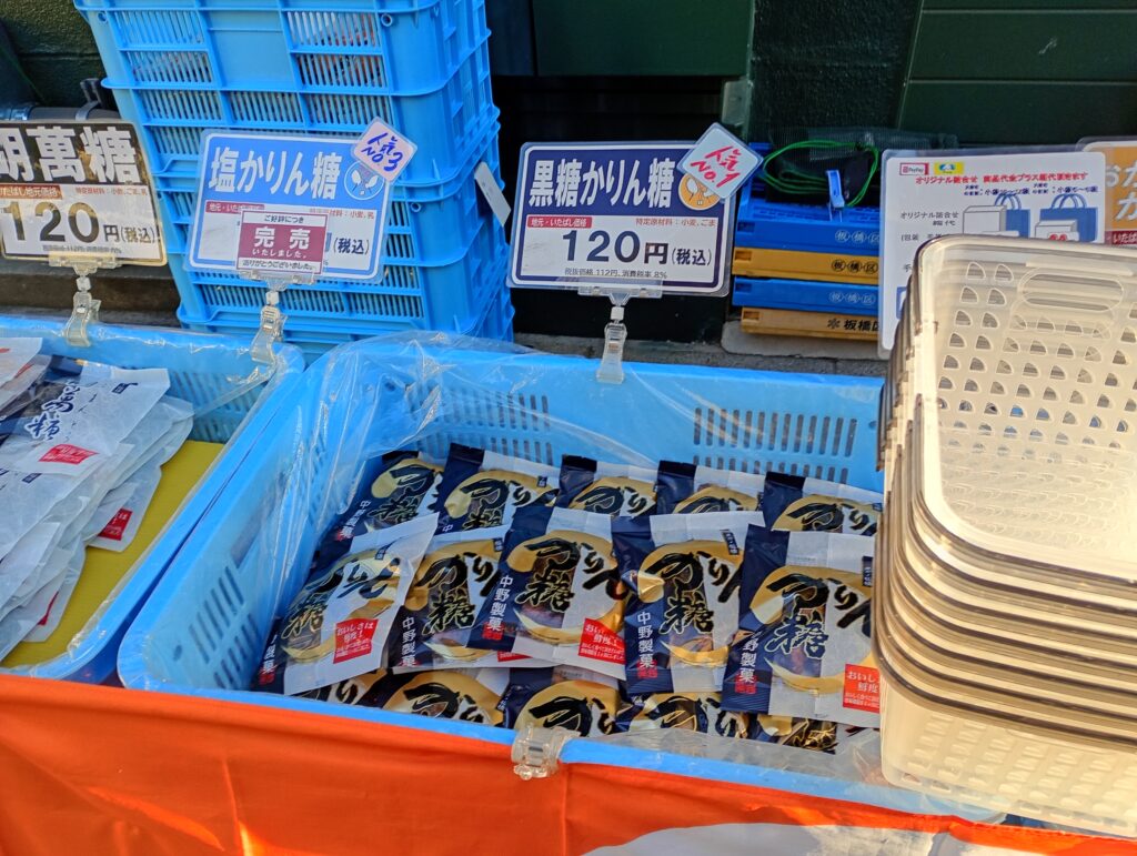 今回、特にお得感があったのが「中野製菓」さん。 通常150円の「黒糖かりんとう」が、朝市価格で120円に!さらに「いたばしPay」を利用したところ、20%ポイント還元(※キャンペーン時)が適用され、驚くほどリーズナブルに購入できました。
