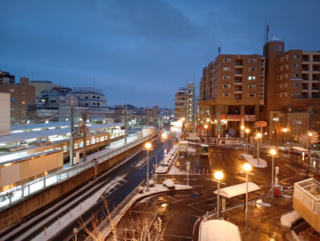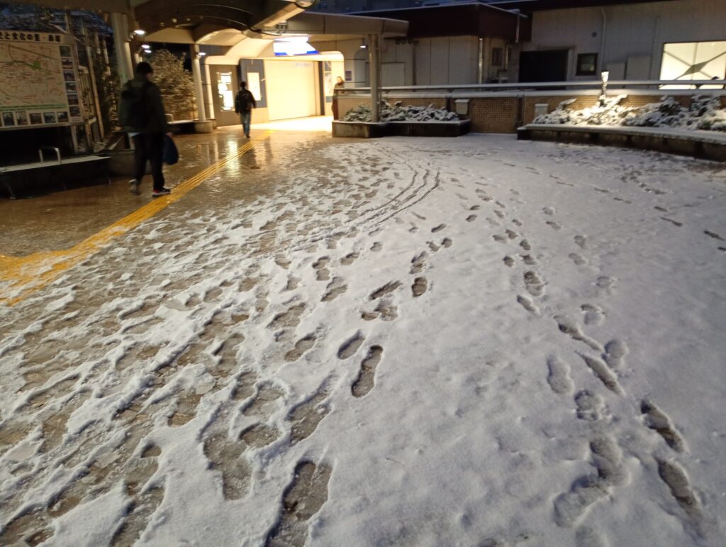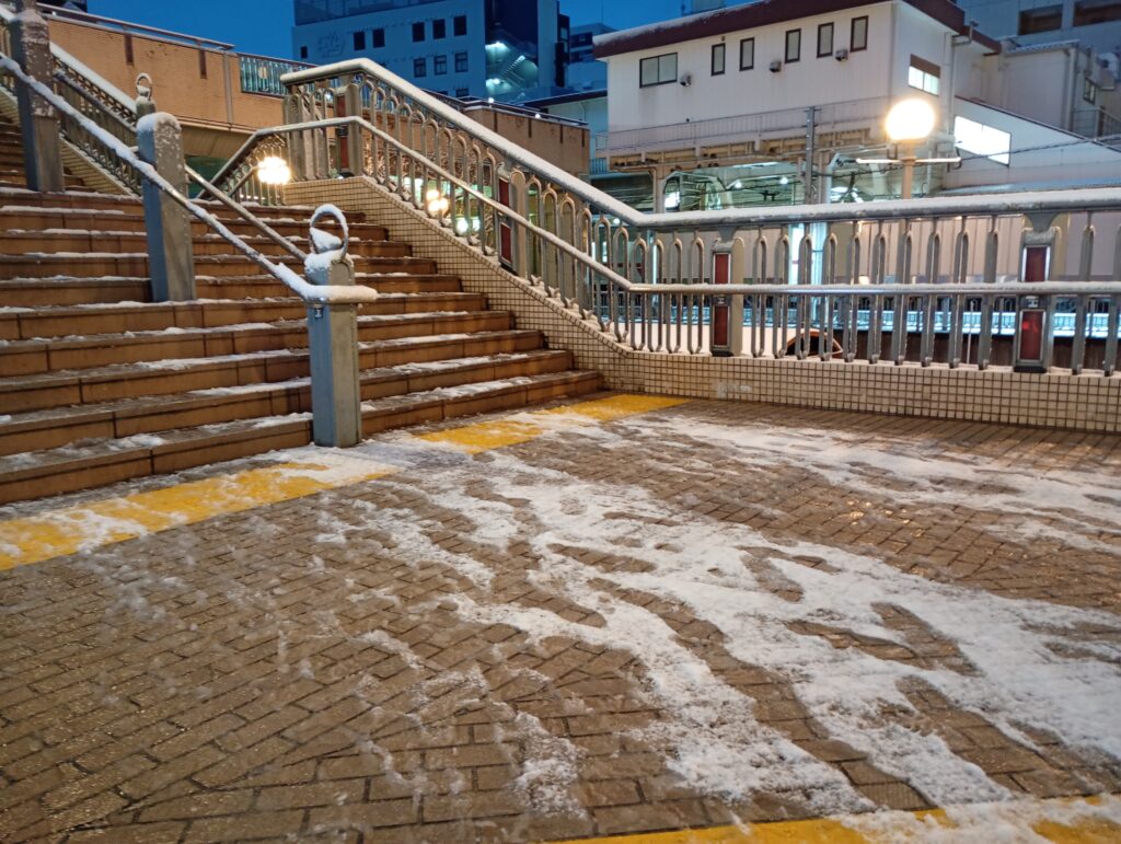- 成増駅周辺: 朝6時時点での積雪は約5cmに達しました。駅前のロータリーでは早朝から除雪作業が進んでいるものの、雪がシャーベット状に変化しており、非常に滑りやすい状態です。通勤や外出をする人々が、足元を確かめながら慎重に歩く姿が見られました。