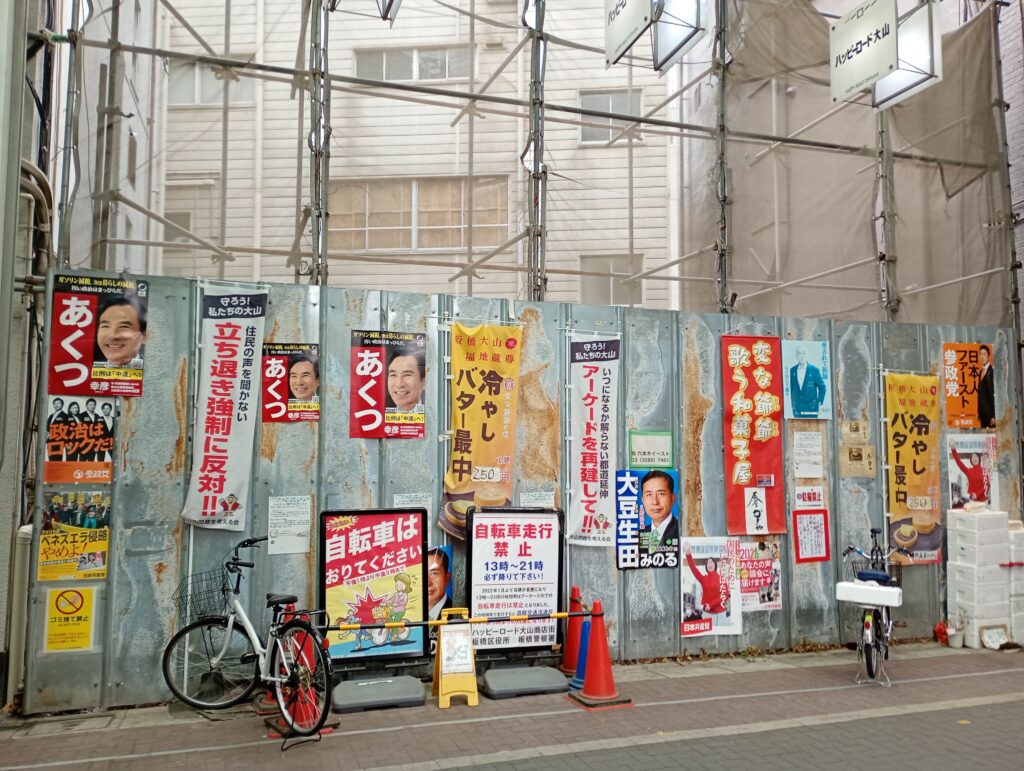 街のいたるところでは、歴史あるアーケードの維持や再開発に反対する「のぼり」が今も掲げられています。特に「コモディイイダ」を中心とした事業者や住民による反対の声は根強く、この街がいかに愛されてきたかを物語っています。