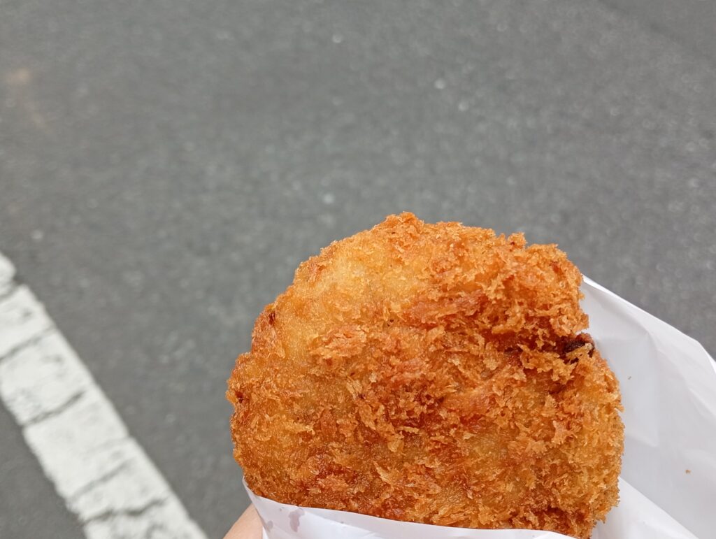 キッチンの入り口にある揚げ場からは、メンチコロッケが揚がる「ジューッ」という心地よい音が……。その音と香りに誘われて、思わずコロッケを追加注文! 我慢できずにいただいた揚げたてのコロッケは、衣がサクサク、中はホクホクで、まさに最高の一言でした。