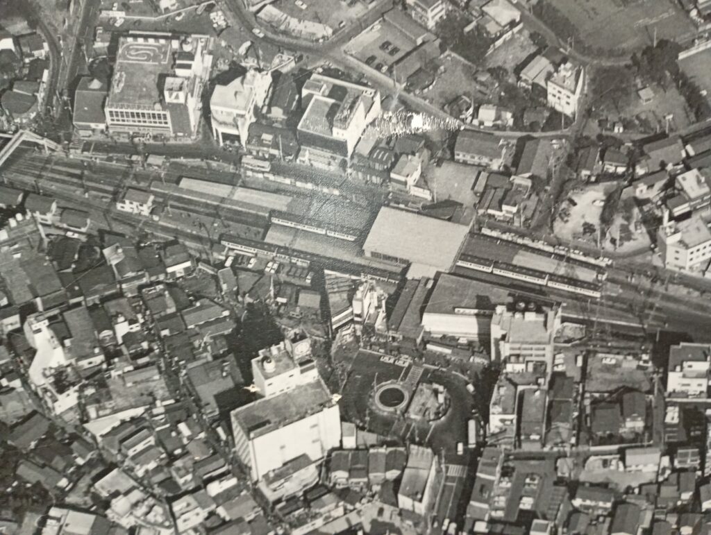 その後、ロータリーの向こう側に見えるSEIYUがアリエスとなりました。ちなみに、当時は高度経済成長期でモータリゼーションのさなかであったため、ロータリーにはタクシースペースが設けられました。実際、写真でもタクシーがたくさん止まっていますね。