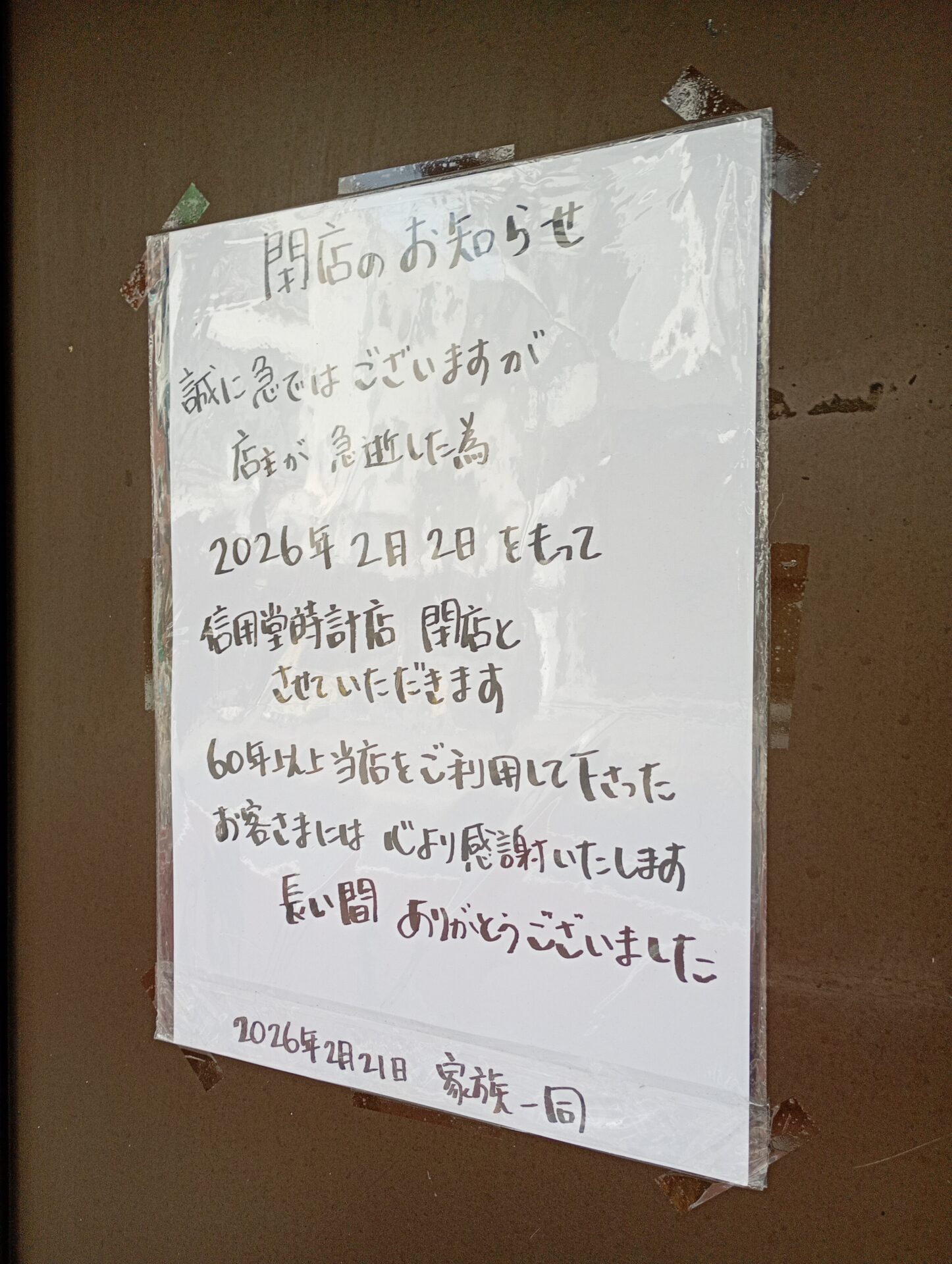板橋区赤塚の地で、半世紀以上にわたり正確な時を刻み続けてきた「信用堂時計店」が、2026年2月2日(月)をもってその長い歴史に幕を下ろしました。