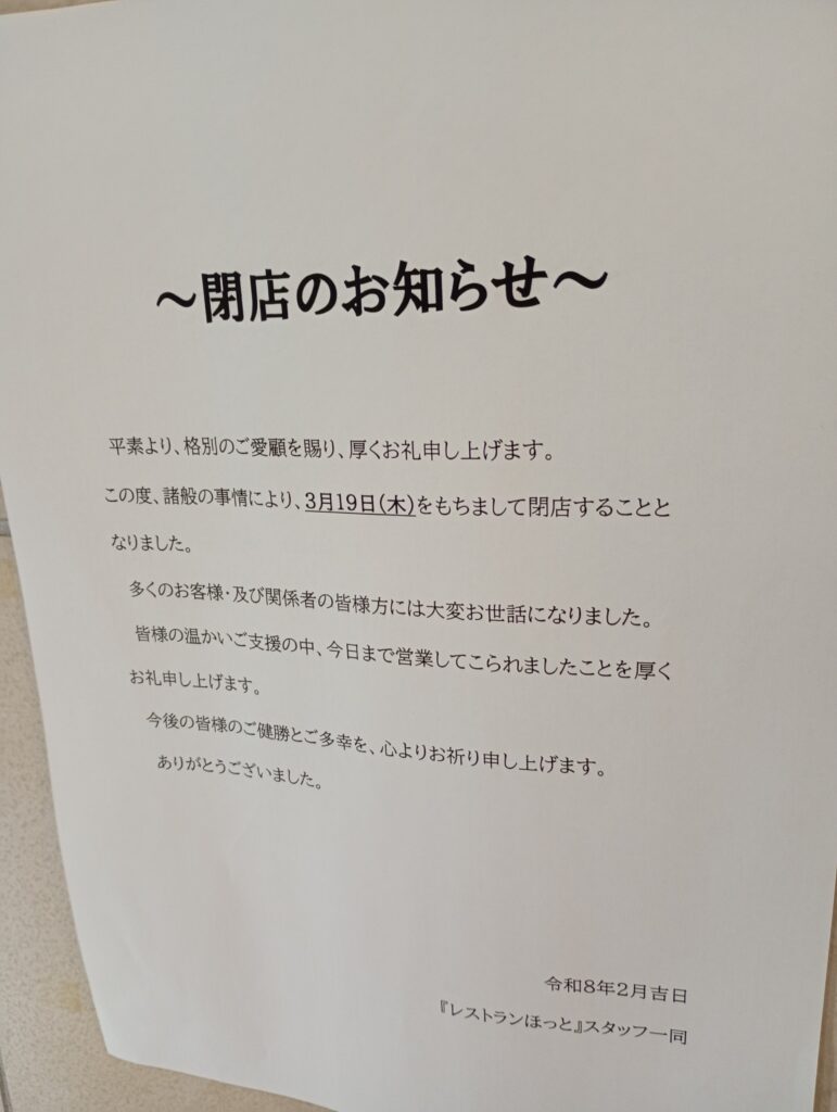 本庁舎1階にある食堂「レストランほっと」が、2026年3月19日(木)をもって閉店することが判明しました。