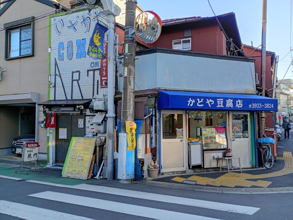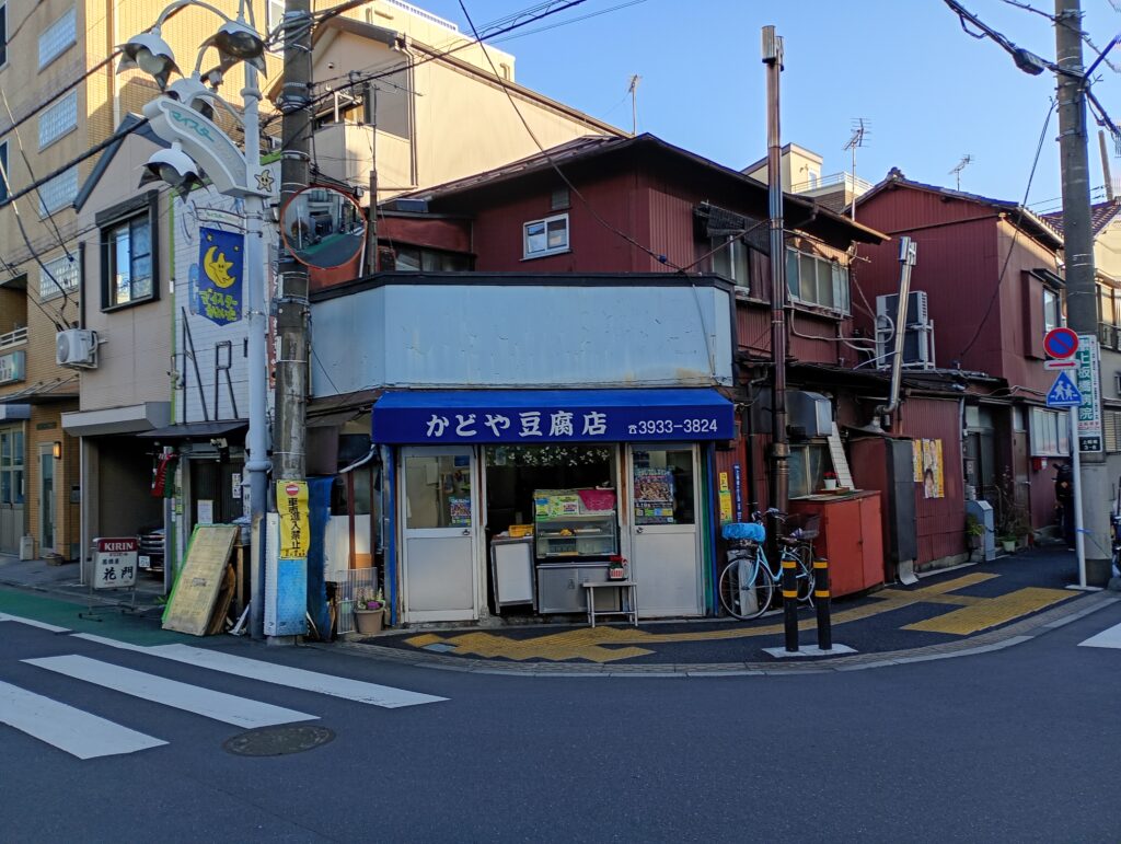 富士見街道と七軒家通りが交差する、その名の通り「角(かど)」に、鮮やかな青いテントが目を引く一軒の豆腐屋さんがあります。