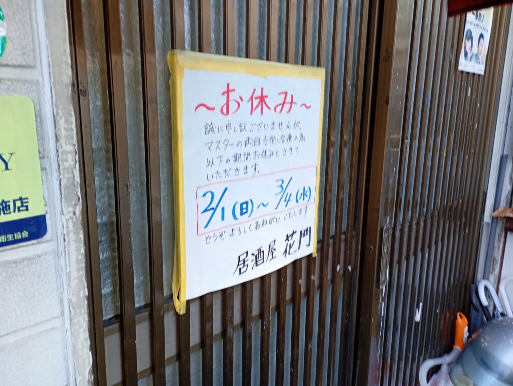 しばらく休店されていた居酒屋花門さんですが、3月4日までの休店予定なので、春の訪れとともに再開しそうですね。