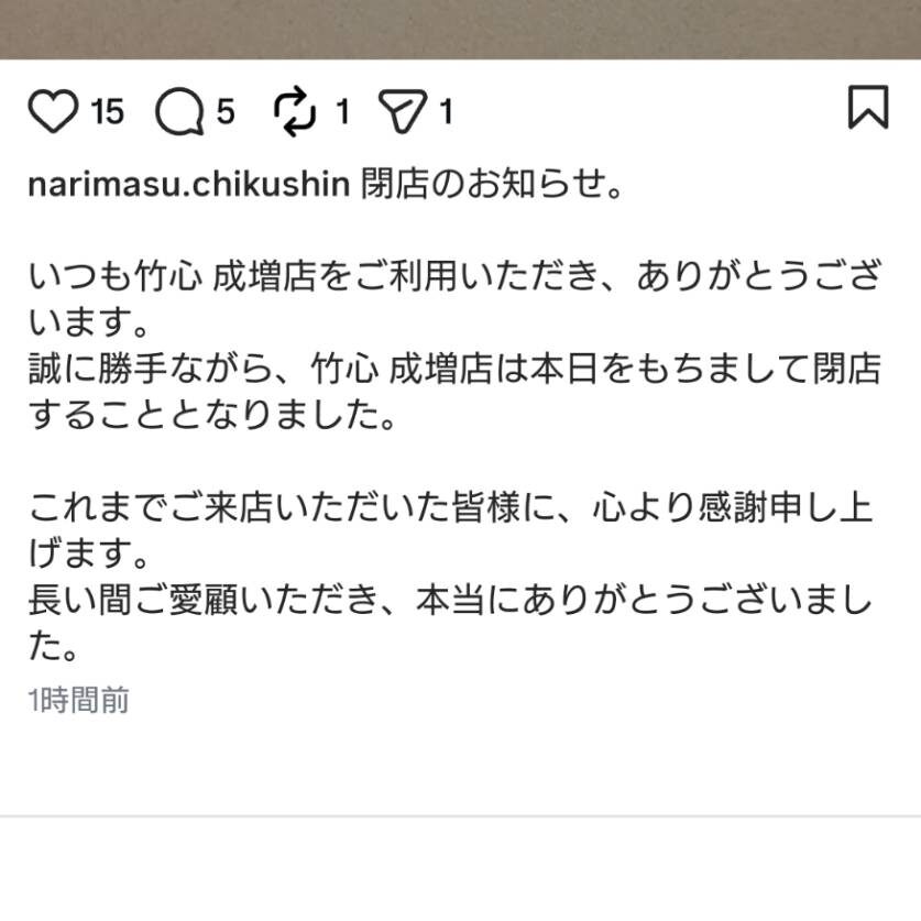 - 「成増の馴染みの店がまた一つ消えてしまって寂しい」 といった驚きと悲しみの声が相次いでいます。