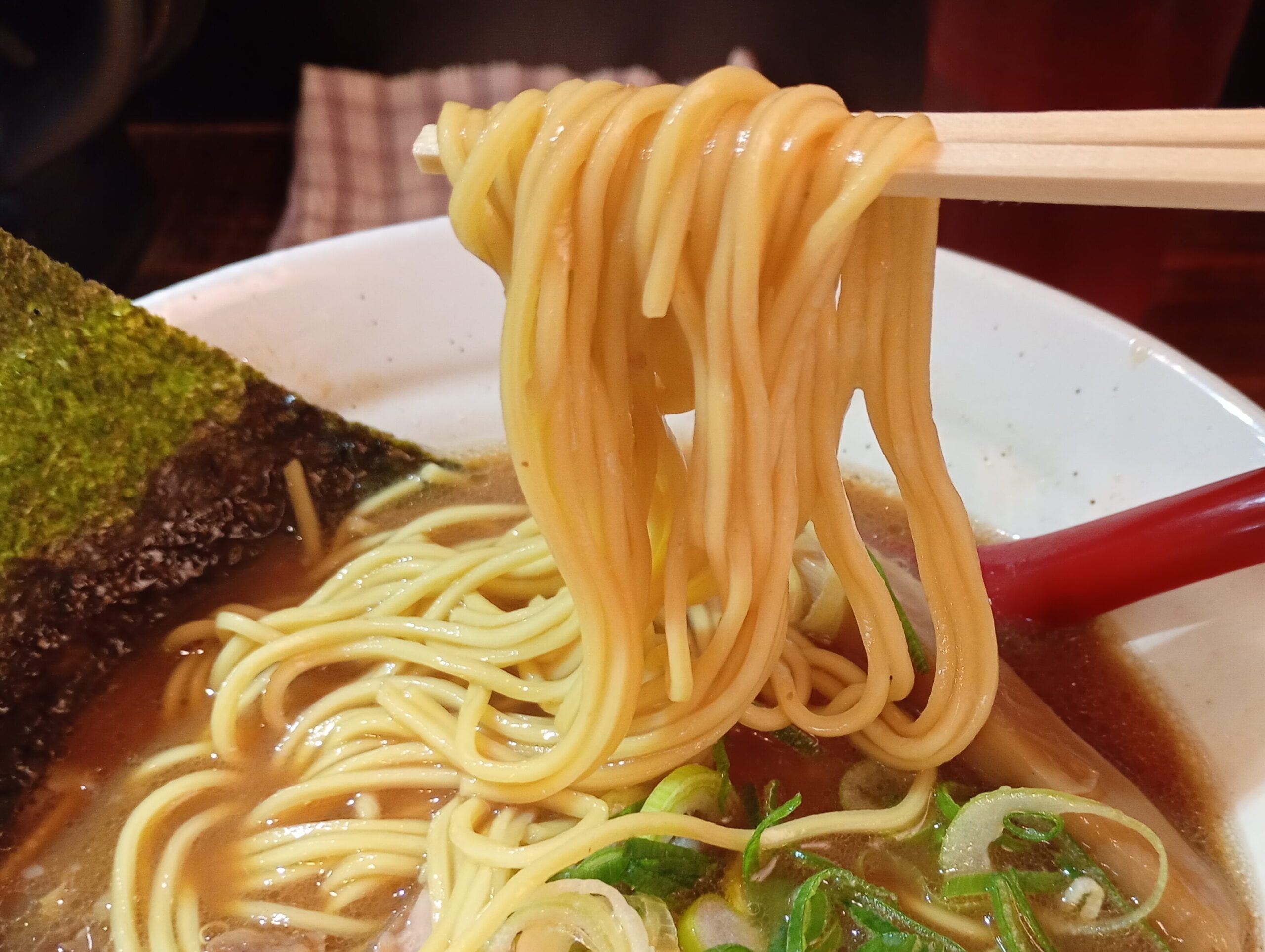 小麦の風味が力強く、スープに負けない存在感の中細ストレート麺。茹で加減への細やかな気配りにより、しっかりとした歯応えと喉越しが楽しめます。