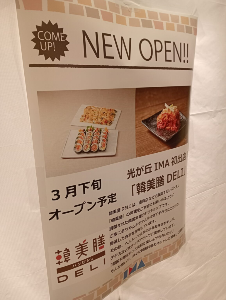 - 3月17日(火)オープン:韓美膳DELI(地下1階) 人気韓国料理レストランのデリショップ。手作りのキムチやナムル、彩り豊かなキンパやチヂミなど、食卓を楽しくする韓国惣菜が揃います。