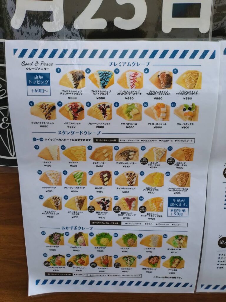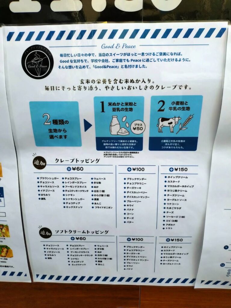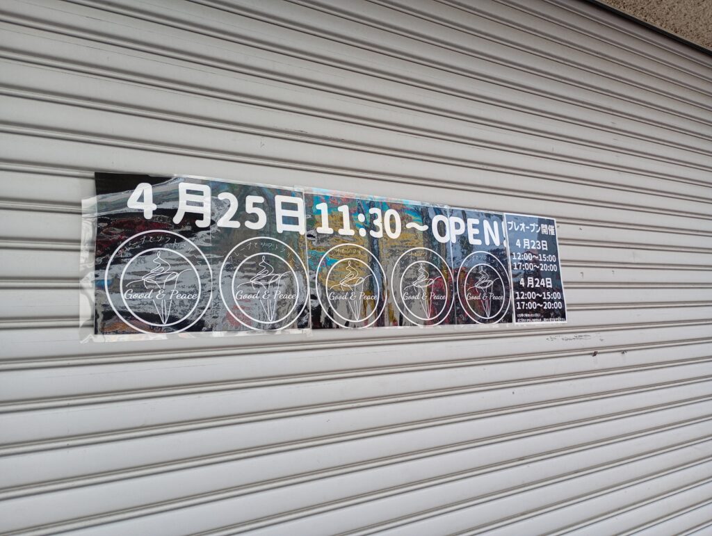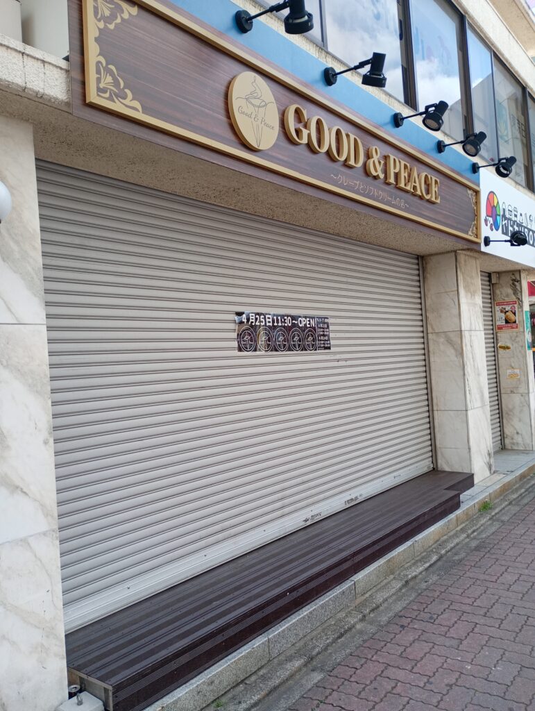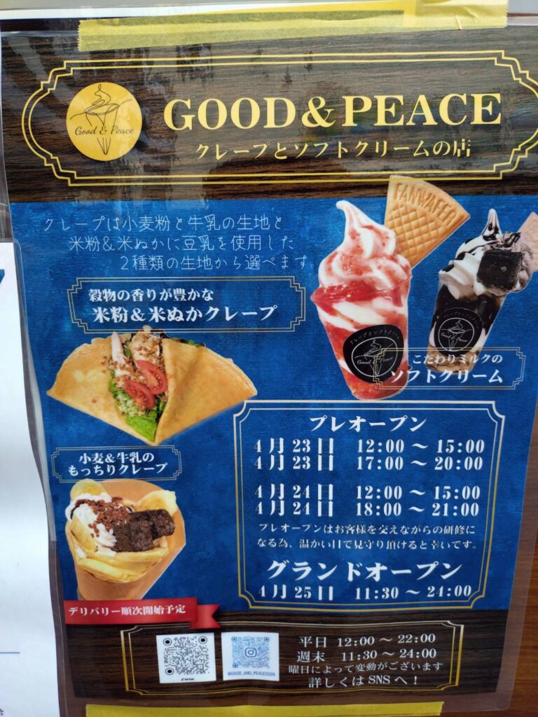下赤塚駅北口のクレープといえば、以前「MARIOクレープ」のオープン告知がありましたが、延期が続き、現在は張り紙もなくなってしまい気になっていた方も多いはず。 今回の「Good&Peace」の登場は、まさに待望の出店と言えそうです。