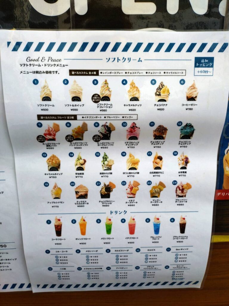 オープン前には店頭にメニューが貼ってありました!クレープとソフトクリームとドリングを注文できるのですね。