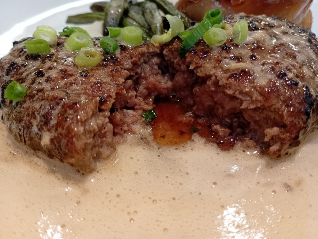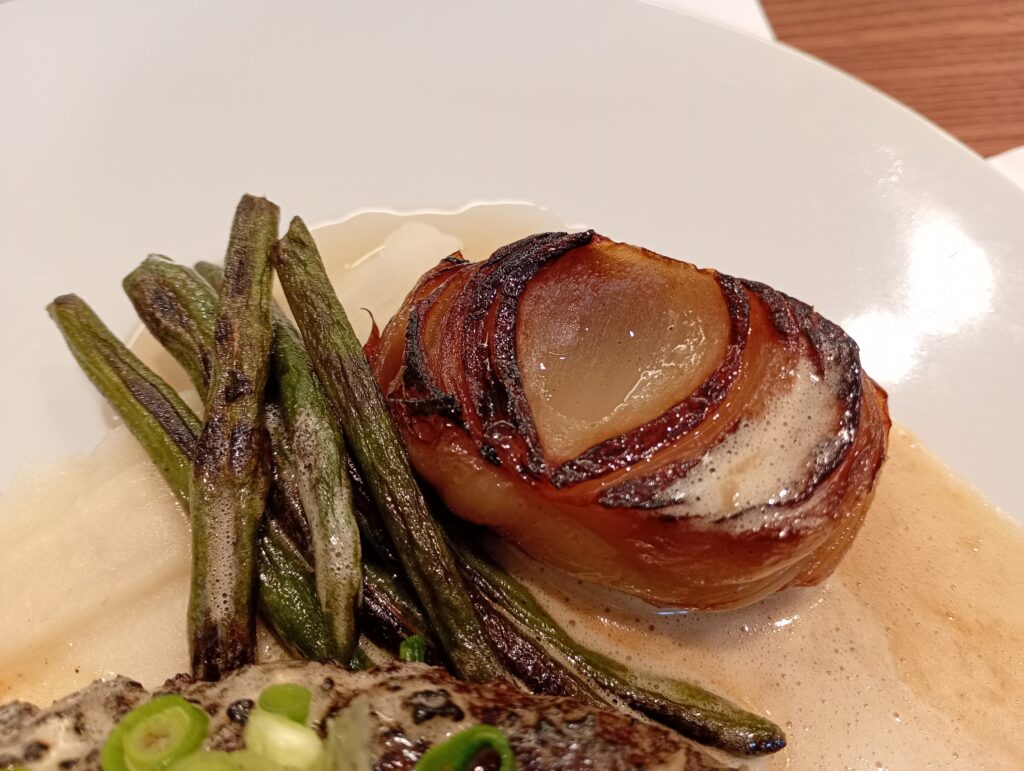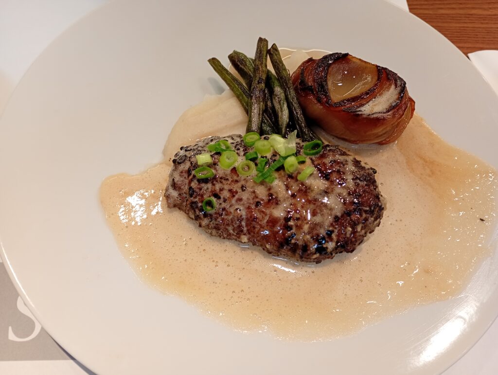 - 絶品のハンバーグ: ハンバーグの名店「アルカンジュ」と連携し、こだわりの味をここ平和台で提供しています。インゲン、玉ねぎ、滑らかなマッシュポテトと共に運ばれてくるハンバーグは、ナイフを入れた瞬間に肉汁が溢れ出す至福の一皿。仕上げに添えられたネギが絶妙なアクセントを加えています。